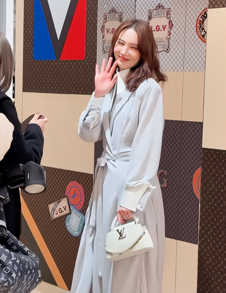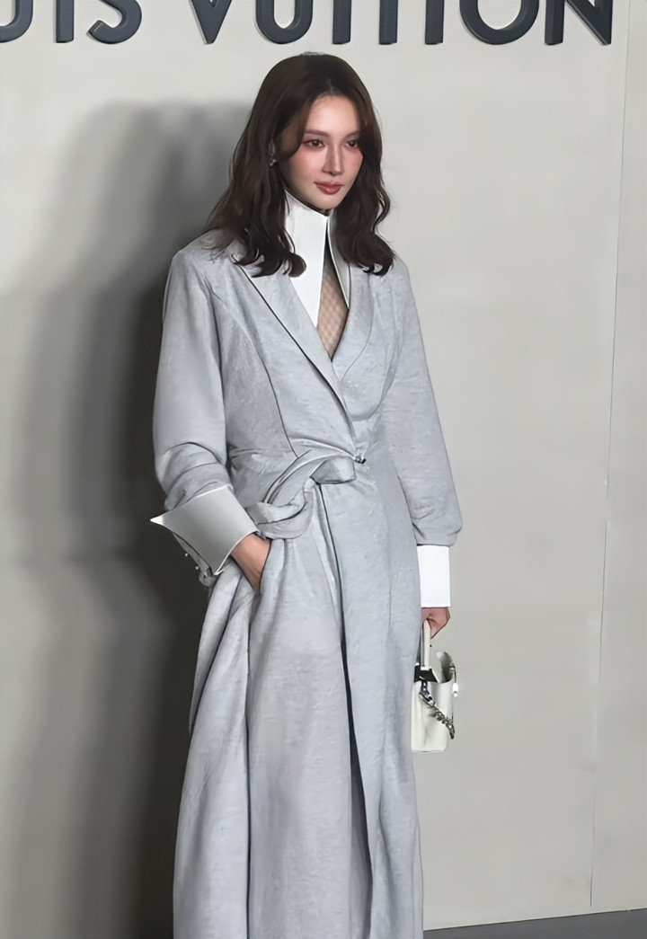 这套浅灰色束腰大衣,刚好适合她这种身材高挑纤瘦的女明星去穿。