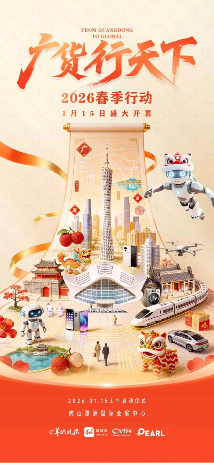 广货又“行”了。1月15日,“广货行天下”春季行动发布会暨家电专场促销活动将在佛山举行,正式拉开2026年度广东产品线上促销活动的序幕。6000余家企业、近30场重点活动,从家电到手机,从服装到食品,众多广东好物正以前所未有的声势走向全国、迈向全球。