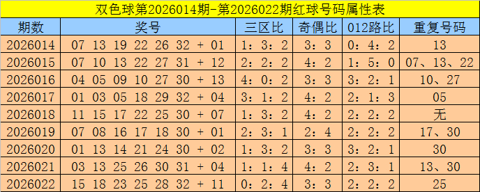 红球012路比:上期红球012路比开出2:2:2,最近9期红球012路个数比为17:23:14,本期预测2路红球热出,宽恕红球012路比2:1:3。