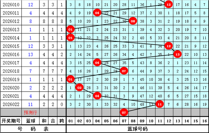 蓝球号码:最近9期分辨开出蓝球号码01、12、13、04、07、01、02、04、11,蓝球号码012路个数比为1:6:2,其中0路蓝球开出最少,本期不错毁灭,参考蓝球01、04、07、13。