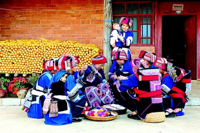 在村舍旁做刺绣的彝族妇女。云南石林县委宣传部提供