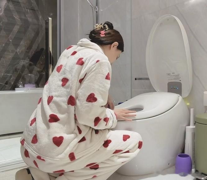 除了洗手盆旁边堆得满满当当,徐璐家里的卫生间其他地方也有不少物品,毛巾都挂在架子上,地面还有好多纸箱子,有种到了杂物间的既视感。她一个人住,什么事都要自己做,包括刷马桶这种家务,也是徐璐蹲地上亲手来清理,这样的徐璐看起来应该是在认真生活的,一点都不娇气。