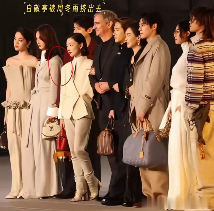 不过,即使负责人的加入,周冬雨还是没有选择挽着白敬亭,在拍照凹造型时,周冬雨更是把白敬亭挤出了画面。