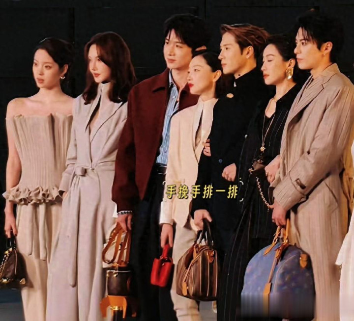 负责人看他们四人之前都是手挽手的,也是很上道的左手挽着王嘉尔,右手挽着周冬雨,现在由四个人变成五个人手挽手站一排了。