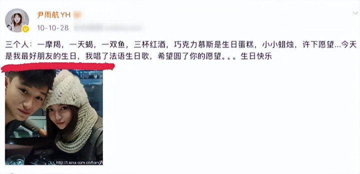 与此同时,尹雨航也晒出了两人的合照,还为其唱了法语生日歌。