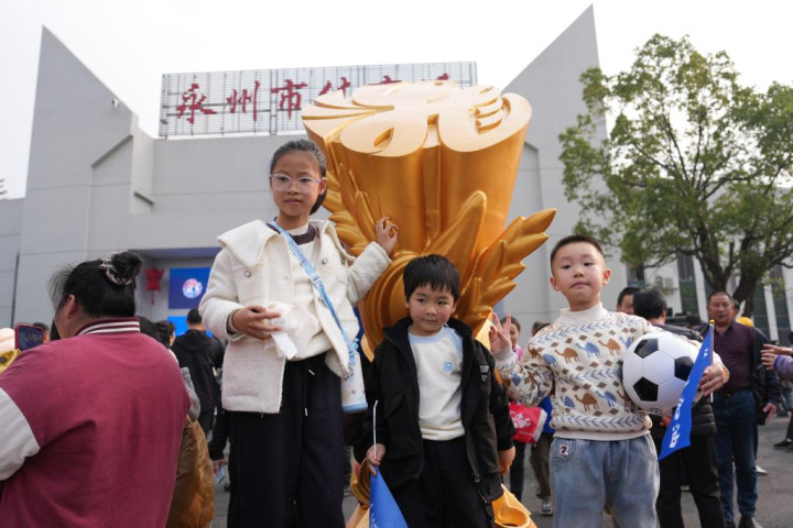 当我赶到永州市体育场时,周围早已人头攒动。这座曾被永州人戏称为“叫花子球场”、被网友热议为“养成系生态球场”的地标,米兰app官方网站如今成了热门打卡地。在体育场外的“湘超”冠军奖杯模型和一幅幅足球墙绘前,上至白发老者,下至垂髫稚子,争相合影留念。