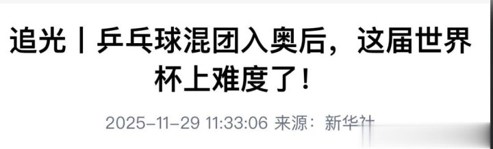 新华网:《追光丨乒乓球混团入奥后,这届世界杯上难度了!》