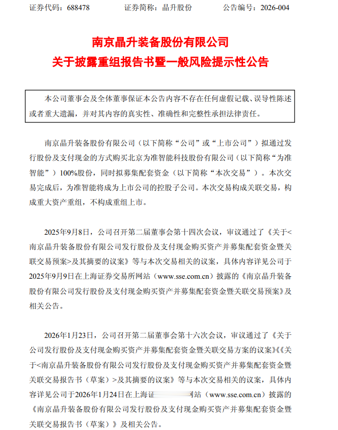 {jz:field.toptypename/}1月23日,晶升股份(688478.SH)公告称,公司拟通过发行股份及支付现金的方式购买本尚科技等10名交易对方持有的为准智能100%股份,凤凰彩票官网app同时募集配套资金。为准智能100%股份的交易作价为8.57亿元。本次交易构成关联交易和重大资产重组,但不构成重组上市。交易完成后,为准智能将成为上市公司控股子公司。