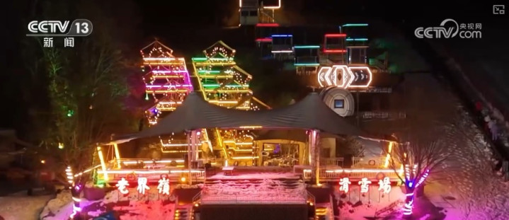 夜幕降临,老界岭滑雪场的雪道上,炫彩灯光次第点亮。游客们踏着雪板飞驰而下,尽显飒爽风采。