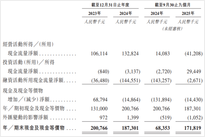 此外,文石科技的现金流也不容乐观。招股书显示,2025年前三季度,公司经营活动产生的现金流量净额为-4120.8万元,较2024年同期的1408.3万元由正转负,降幅超过390%。现金流是企业的“血液”,经营性现金流为负意味着核心业务产生现金的能力不足,需依赖外部融资或自有资金垫资运营。