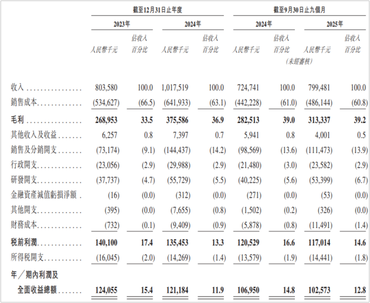 据公司招股书,2023年至2025年前三季度,公司营收分别为8.04亿元、10.18亿元、7.99亿元,整体营收保持阶段性增长态势,但净利润却从2023年的1.24亿元降至2024年的1.21亿元,2025年前三季度同比下滑4.1%至1.03亿元。这种“增收不增利”的情况,本质是盈利能力的弱化。