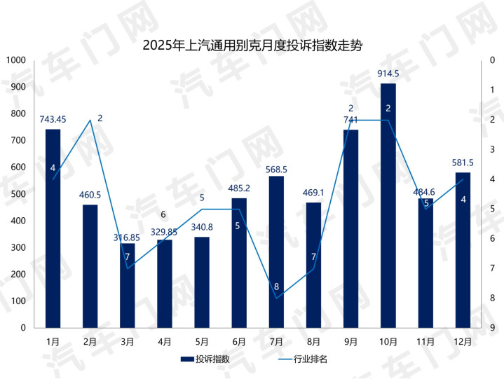 从月度走势来看,全年12个月上汽通用别克共有7个月投诉指数进步400。行业名次中,其更是有8个月稳居TOP5之列。不出丑出,2025年上汽通用别克的全体投诉指数与名次王人处于高位。