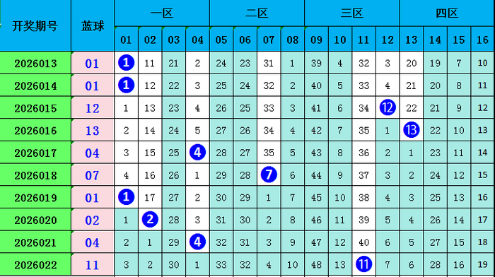 上期蓝球开出号码11,近十期开出蓝球在一区6个,二区1个,三区2个,四区1个,一区走势热,四区走势较冷,本期预测蓝球出现时三区,重心眷注号码12。
