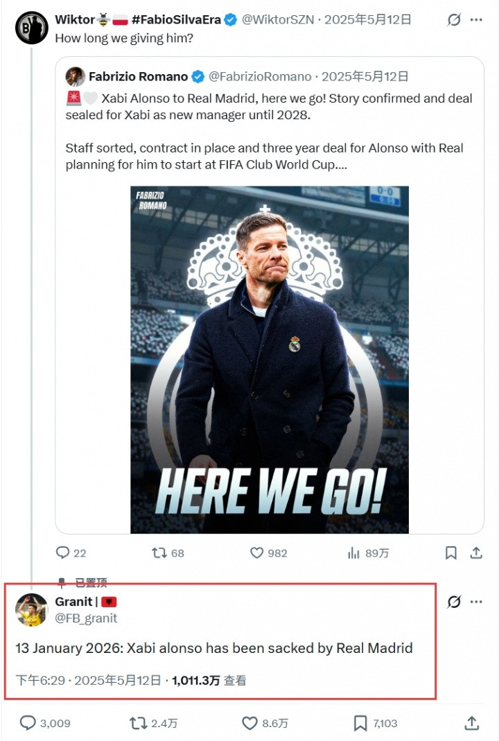 在去年5月12日——也就是罗马诺用“HereWeGo”宣布阿隆索将执教皇马的当天,这位名叫Granit的球迷发帖预测道:“2026年1月13日,凤凰彩票app下载哈维·阿隆索被皇家马德里解雇。”