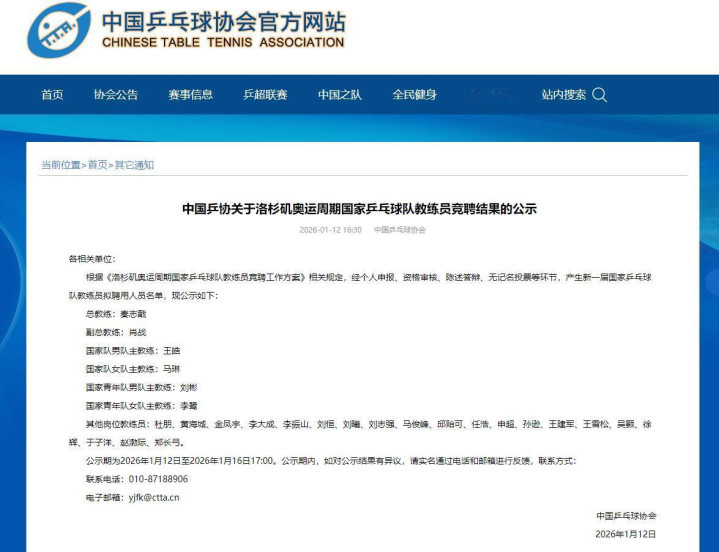 1月12号乒协官网刚公示完洛杉矶奥运周期的名单,秦志戬、王皓这些老熟人稳居核心,还添黄海诚回归、孙逊挑大梁的新变动,功勋老帅李隼正式卸任。