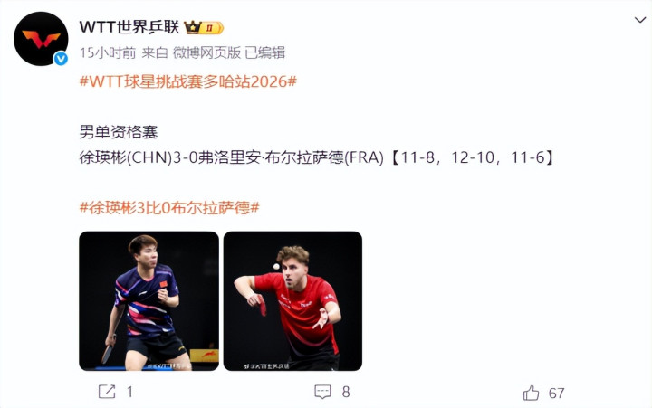 三局比分分别是11-8、12-10、11-6,整体节奏完全在徐瑛彬手里,进攻又猛落点又刁,根本没给对手任何翻盘的机会。