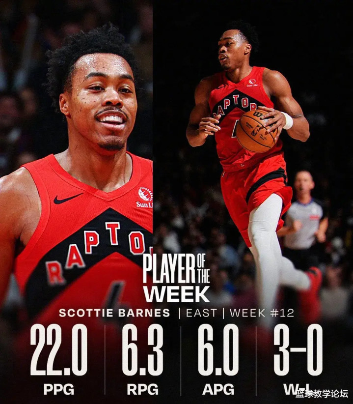 NBA官方宣布:猛龙的斯科蒂-巴恩斯当选东部周最佳球员,巴恩斯上周场均22分6.3篮板6助攻,率领猛龙3胜0负;掘金的佩顿-沃特森当选西部周最佳球员,沃特森上周场均24.5分8篮板4助攻1.3抢断1.8盖帽,率领掘金3胜1负。