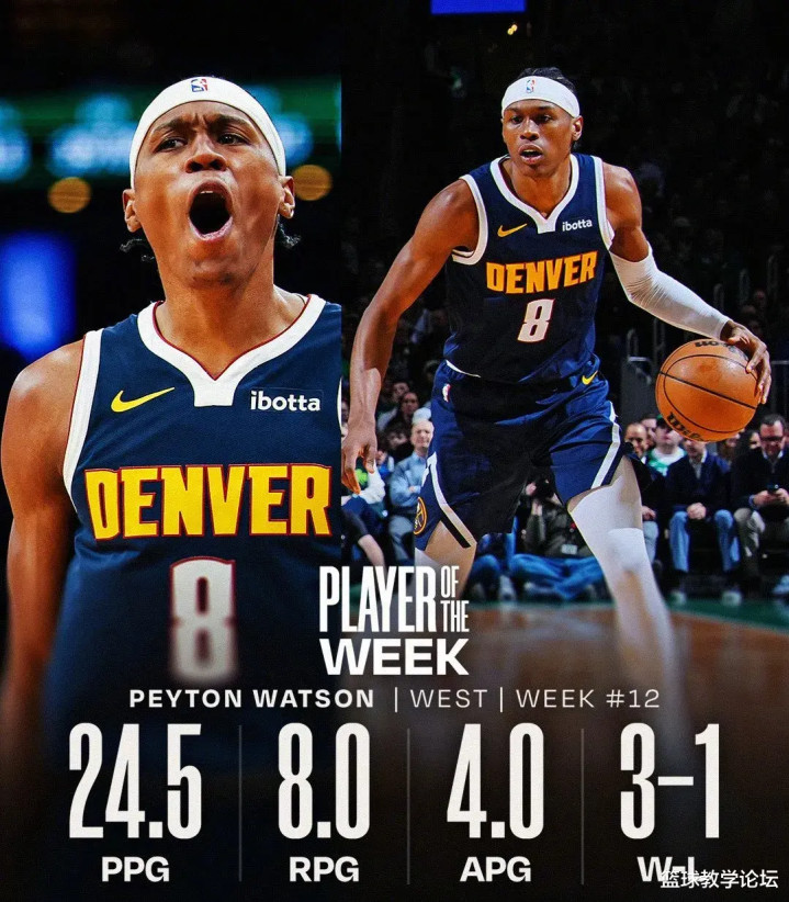 沃特森能够荣膺西部周最佳,估计很多球迷都没想到。在约老师长期缺阵的情况下,掘金还能保住西部第三,沃特森功不可没。这是沃特森生涯第一次荣膺周最佳,他也成为约基奇和穆雷之后,本赛季第三个拿到周最佳的掘金球员。