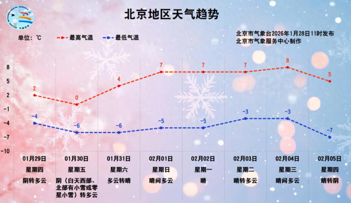 本周末(1月31日至2月1日),气温回升,天气晴好,适宜大家周末出游和户外活动。1月29日至2月5日白天最高气温0℃至8℃,夜间最低气温-7℃至-3℃。